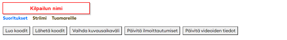 Kirjaudu omilla tunnuksilla, valitse välilehti Kisat ja paina oikean kilpailun nimeä. Sivulla on kolme välilehtiä - Suoritukset, Striimi ja Tuomareille.