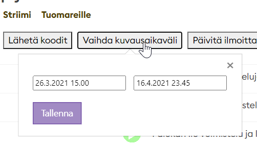 HUOM! Muista aina asettaa kuvausaika ensimmäiseksi! Jos kilpailija saa koodin, johon ei asetettu kuvausaikaa sovellus ei pysty avaamaan oikeata kilpailua.