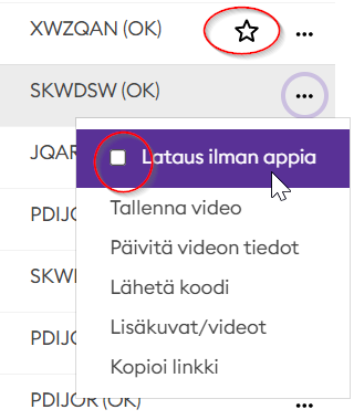 Joissakin tapauksissa kilpailijoille voi antaa luvan ladata viedo ilman sovellusta. Tässä tapauksessa paina kolmea pistettä kilpailijan rivillä ja valitse Lataus ilman appia. Riville ilmestyy tähti-kuvake.